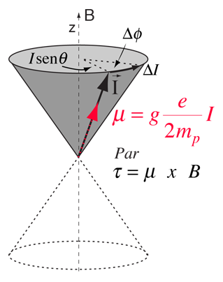 Cuando un momento magnético se coloca en un campo magnético, tenderá a alinearse con el campo. El momento magnético se puede visualizar clasicamente como un bucle de corriente, y la influencia sobre el alineamiento, se puede describir como un par sobre un bucle de corriente, ejercido por un campo magnético. Se puede extender la idea del momento magnético como un bucle de corriente, para describir los momentos magnéticos de los electrones orbitales, el espín del electrón y los espines nucleares. En cada caso, el momento magnético está asociado con el momento angular, y se puede identificar un par de fuerza que tiende a alinear el momento magnético con el campo magnético. En el caso nuclear, el momento angular involucrado, es el momento angular intrínseco I asociado con el espín nuclear.