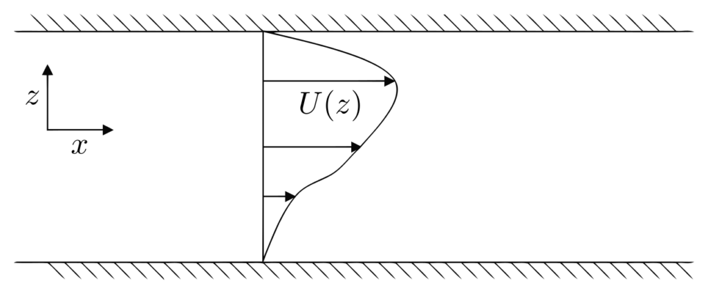 Un diagrama esquemático del estado base del sistema. El flujo bajo investigación representa una pequeña perturbación respecto a este estado. Mientras que el estado base es paralelo, la velocidad de la perturbación tiene componentes en ambas direcciones.