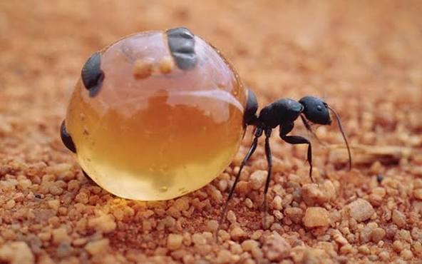 Donde logicamente el almacenamiento de la miel es completamente distinto en las hormigas pero semejante porque el panal en su repsus que es el polígono donde se colocara una larva se enriquecerá en miel.
